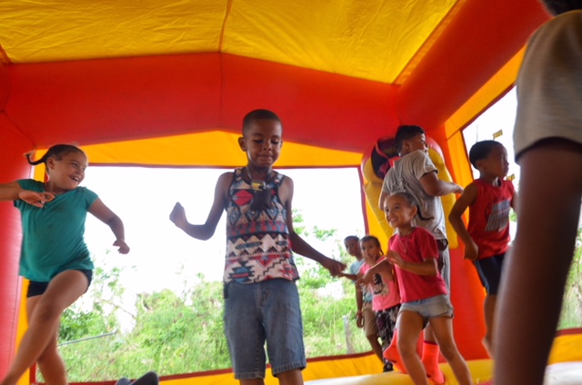 Debajo de otra carpa varios niños dibujan con acuarelas, mientras una sicóloga conversa con ellos sobre lo que han vivido durante las últimas semanas. Usan sus dedos como pinceles mientras la memoria los lleva al día del huracán y lo que han sido sus vidas desde entonces.